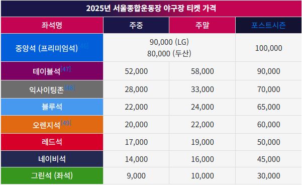 한국시리즈 1, 2, 6, 7차전이 열리는 서울종합운동장 야구장은 다음과 같은 가격대로 운영됩니다.