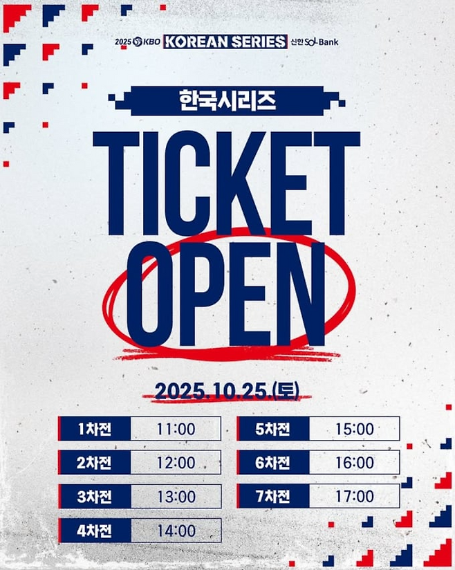 2025년 한국시리즈 티켓 예매는 10월 25일 토요일 오전 11시부터 경기별로 순차적으로 진행됩니다. 1차전은 오전 11시, 2차전은 정오 12시, 이후 매시간 정각마다 7차전까지 예매가 열립니다. 예매가 순차적으로 진행되는 이유는 접속 분산을 위함이며, 예매 시간은 다음과 같습니다.