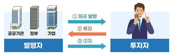 쉽게 말해 돈이 필요한 곳에 돈을 빌려주는 대가로 사전에 정해진 이자를 받고 해당 기간이 끝나면 빌려준 돈을 돌려받는 차용증서 성격의 유가증권이라고 할 수 있습니다.