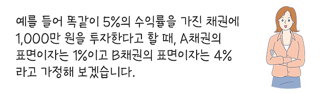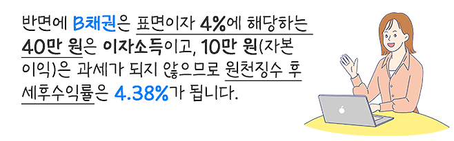 A채권의 경우 표면이자 1%에 해당하는 10만 원은 이자소득으로 과세되고, 4%에 해당하는 40만 원(자본이익)은 과세가 되지 않으므로 원천징수 후 세후수익률은 4.85%가 됩니다.