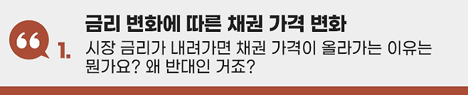 즉, 기존에 발행된 채권은 거래가액(채권가격)을 낮춰 부족한 수익률을 메워 줘야만 거래가 이뤄질 것입니다. 따라서 금리가 상승하면 채권가격이 하락하게 됩니다.