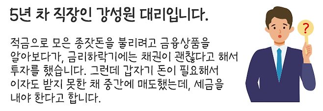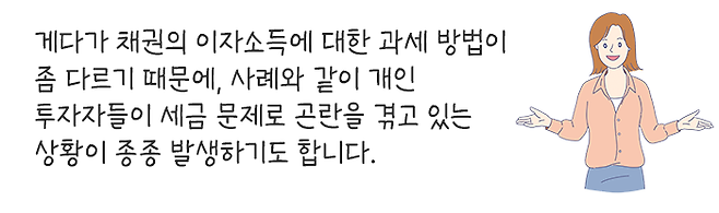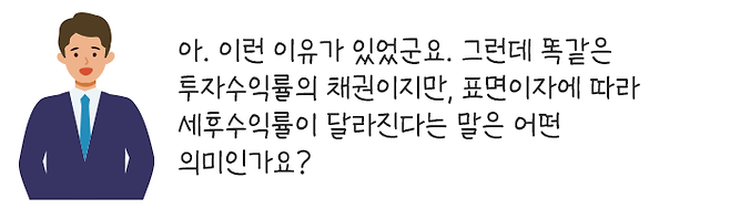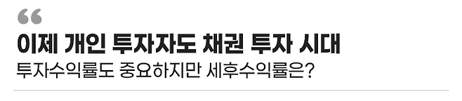 이렇게 많은 개인 투자자들이 채권 투자에 주목하고 있지만, 초기 투자 시에 투자수익률은 중요하게 생각하면서 세금 즉, 세후수익률에 대해서는 크게 신경을 쓰지 못하는 경향이 있습니다.
