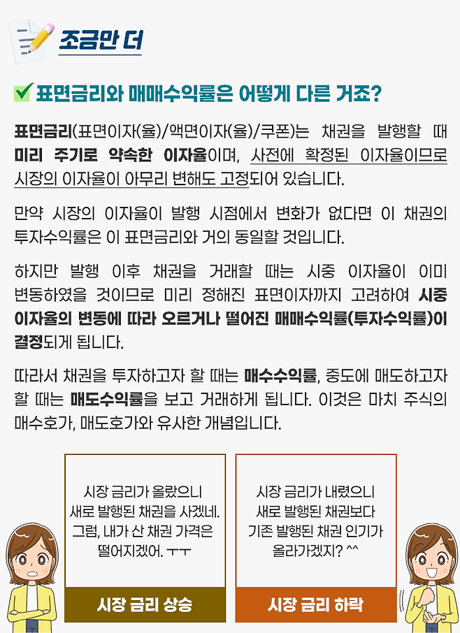 그래서 채권 중도매매는 시중의 채권금리 상황에 따라 신중하게 결정하셔야 하는데, 금리 움직임에 따라 금리가 상승했다면 손실, 금리가 하락했다면 이익이 발생할 것이기 때문입니다.