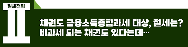 채권의 이자소득은 금융소득에 포함되므로 다른 이자와 배당소득을 합산하여 연 2천만 원을 초과할 경우 종합과세 대상이 되어 세 부담이 증가하므로, 채권 투자 시에도 반드시 절세를 고려하셔야 하는데요.