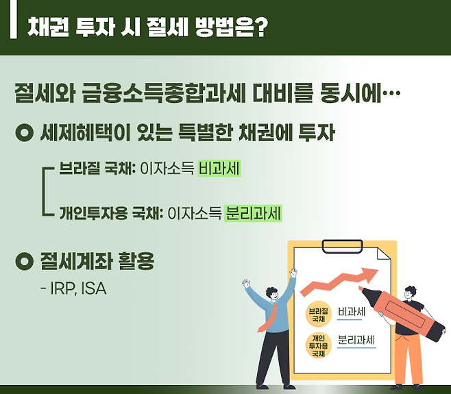 채권 투자 시에 활용할 수 있는 절세 방법은 2가지를 말씀드릴 수 있는데, 첫 번째로 세제혜택이 있는 특별한 채권, 즉 브라질국채와 개인투자용 국채에 투자하는 방법이 있습니다.