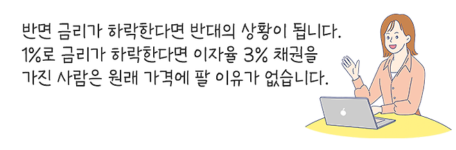 10,000원에 발행한 채권이 발행 당시 이자율이 3%였는데 시장의 금리가 올라가서 5%가 되면 이 채권을 사고자 하는 사람은 이자율이 3%인 채권을 10,000원에 사려고 하지 않을 것입니다.