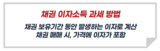 그리고 채권에 투자할 경우 발생하는 소득은 보통 이자소득과 자본이익으로 구분할 수 있는데, 채권의 이자소득은 보통 보유기간 과세라고 하여 투자자가 채권을 보유한 기간 동안 발생하는 이자로 계산합니다.