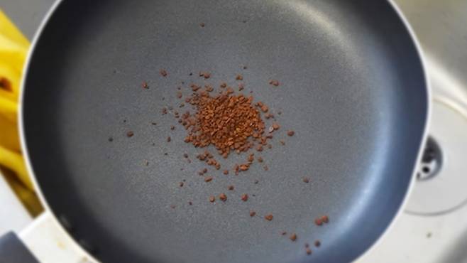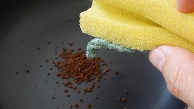 세 번째! 프라이팬 기름때 제거하기. 기름진 음식을 요리한 후, 아무리 세제로 닦아도 미끈거리는 프라이팬. 이럴 땐 믹스커피를 이용하면 커피가 기름때를 흡수하여 보다 쉽게 세척이 가능해요.