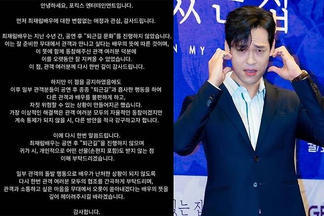 이어 “최재림 배우의 귀가 시, 개인적으로 어떤 선물(손 편지 포함)도 받지 않는 점 이해 부탁드리겠다. 일부 관객의 돌발 행동으로 배우가 난처한 상황이 되지 않도록 다시 한번 협조를 간곡하게 부탁드린다”라고 호소했습니다.