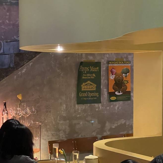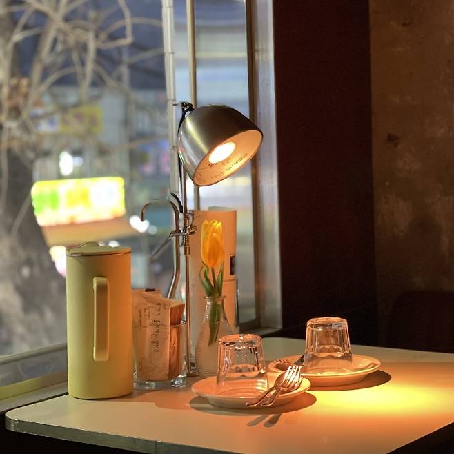 오래된 계단을 따라 올라가다 보면 천장부터 바닥까지 건물의 흔적이 그대로 담긴 공간을 발견하게 된다. 거기에 컬러풀한 테이블과 의자, 가로수 뷰를 맘껏 만끽할 수 있는 의자가 보인다. 서로 어울릴 것 같지 않은 조합으로 이루어진 이 공간은 힙당동의 정체성과도 닮아 있다. 내부 계단을 그대로 둬 마치 인테리어의 한 부분처럼 느껴지기도 한다. 공간은 다소 협소한 편. 점심에는 레스토랑으로, 밤에는 와인을 즐길 수 있는 와인바로 변신한다. 불고기를 베이스로 파스타 면과 파를 곁들인 문화식당 삽합, 베이컨 크림 오므라이스 등 퓨전 경양식을 만날 수 있다.