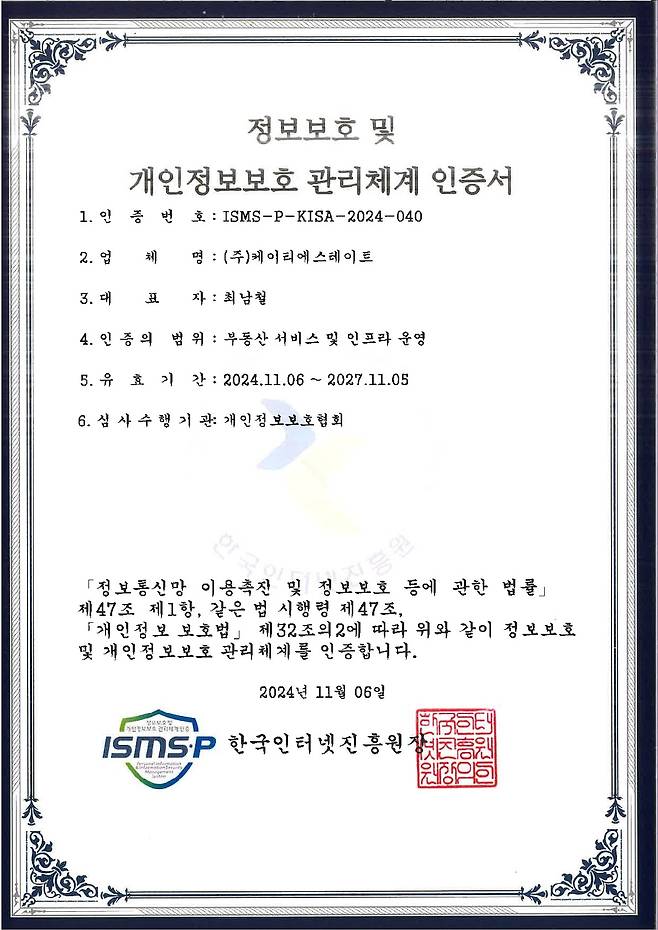 KT에스테이트(대표이사 최남철)가 국내 최고 수준의 보안관리체계인 ‘ISMS-P’(Information Security Management System-Privacy)를 획득했다고 오늘(28일) 밝혔다.