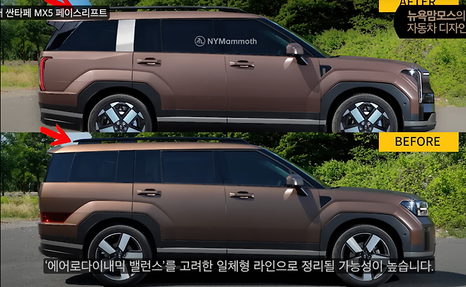 ‘NY Mammoth’의 렌더링과 테스트 차량을 보면 전면부는 분할형 헤드램프 구조를 채택하고, 상단부에는 얇은 주간주행등(DRL)이 수평으로 자리한다. 하단 그릴은 기존보다 좁아지고, 전기차처럼 폐쇄형 디자인이 적용되어 정제된 인상을 준다. 후면은 얇은 테일램프와 세로형 라이트바, 그리고 수평으로 연결된 H자 시그니처로 구성되어, 럭셔리 SUV에 버금가는 고급스러움을 보여준다.