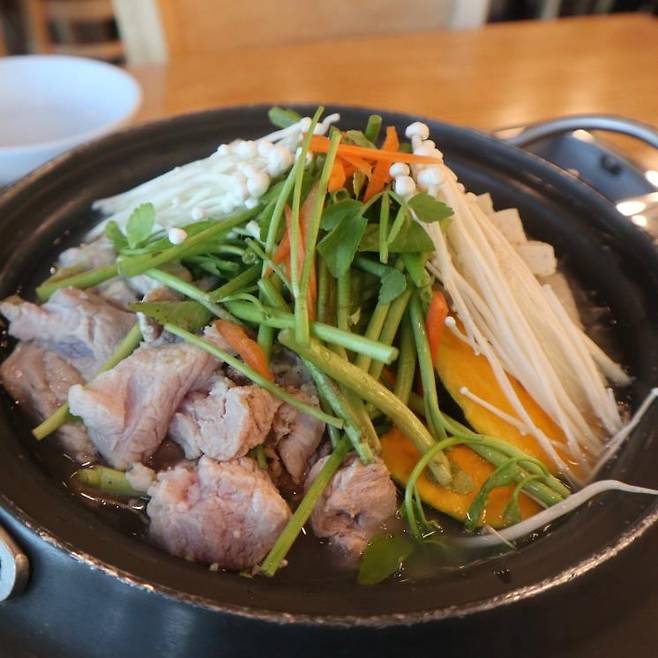 전등사에서 남문 쪽으로 나오면 바로 보이는 남문식당. 창문이 모두 통창으로 되어 있기 때문에 탁 트인 느낌을 주는 것이 이곳의 매력이다. 여기서도 젓국갈비를 맛볼 수 있는데 새우젓으로 깊게 우려낸 육수에 갈비와 야채, 두부, 버섯을 넣고 팔팔 끓여준다. 고기를 먹기 전 향긋하고 아삭한 미나리와 숙주를 먼저 즐겨보자. 고기는 푹 익혀서 먹을수록 부드럽고 풍미가 깊어져 야채 먼저 먹고 나중에 즐기는 게 좋다고. 야외 테이블이 마련되어 있으니 날이 좋다면 주변 자연 경관을 보며 젓국갈비를 즐기는 것도 좋겠다.