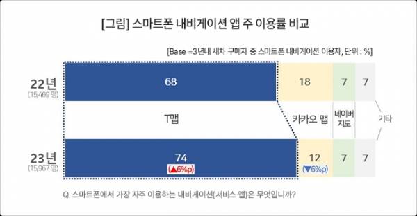 아울러 지난 1년간 티맵 이용률이 증가했고 카카오맵은 큰 폭으로 감소했다. 이번 조사는 3년 내 신차 구입자 중 스마트폰 내비게이션을 이용하는 1만5967명에게 어떤 내비게이션 앱을 주로 쓰는지 묻고 그 결과를 분석했다.