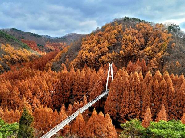 대전 장태산자연휴양림은 최근 몇 년간 SNS상에서 국내에서 가장 아름다운 단풍 명소로 손꼽히는 곳입니다. 하늘을 찌를듯 높게 자란 메타세쿼이아 나무 약 6,700여 그루가 군락을 이루고 있어 평소 도심에서 쉽게 볼 수 없는 웅장한 가을 풍경이 펼쳐지는데요. 단풍철이 되면 나뭇잎을 물들인 붉은 단풍이 불타오르는 듯 장관을 선사합니다.