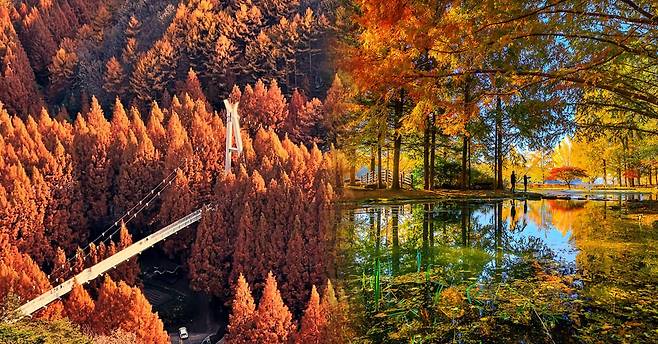 휴양림 내 곳곳에 연못 포토존, 메타세콰이어길 등 다양한 포토존은 물론, 단풍 사이에서 잠시 쉬어가기 좋은 의자와 정자 등이 다수 마련되어 있어 온가족과 함께 느즈막히 단풍놀이를 즐기기에도 좋습니다.