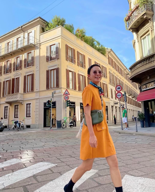 데님 팬츠와 트위드 재킷으로 우아함을 더하거나, 오렌지 미니 원피스에 그린 크로스백을 매치한 화사한 스타일링은 나이를 잊은 듯한 생기와 세련됨을 뽐냈다.