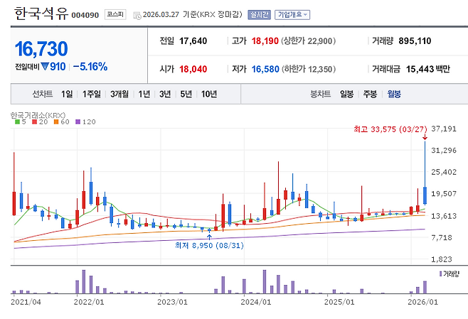 이란 전쟁 발발 직후 한국석유는 하루 만에 +29.79% 급등했다. 이후 수일에 걸쳐 52주 신고가 33,575원을 기록했다. 저점 8,950원 (24.08.31) 대비 3.75배였다