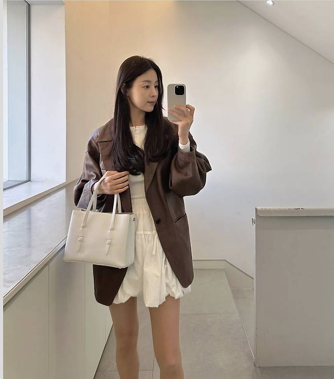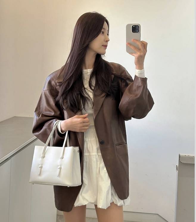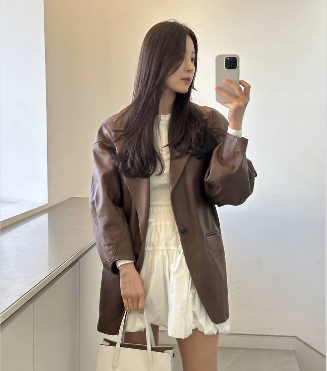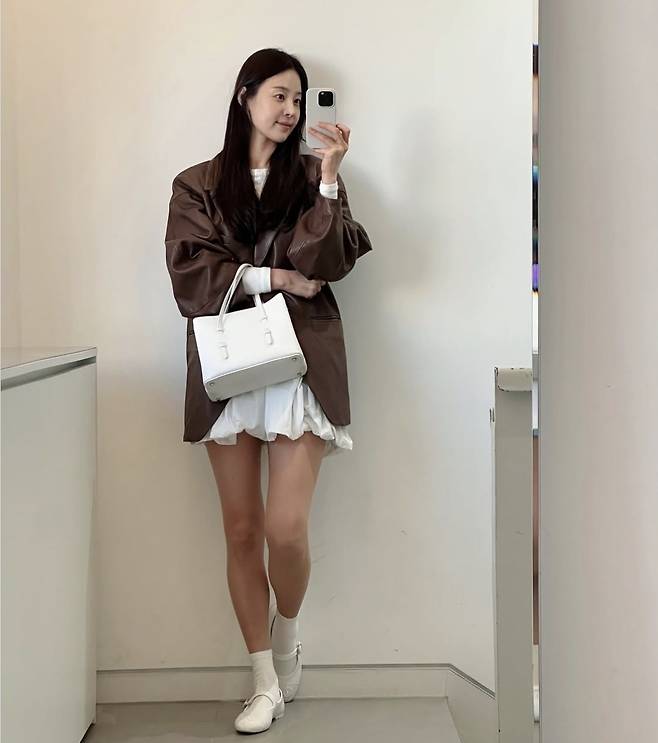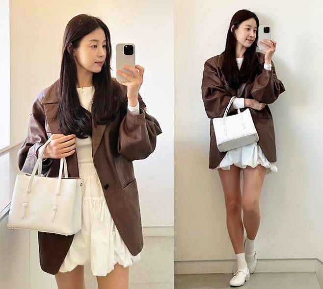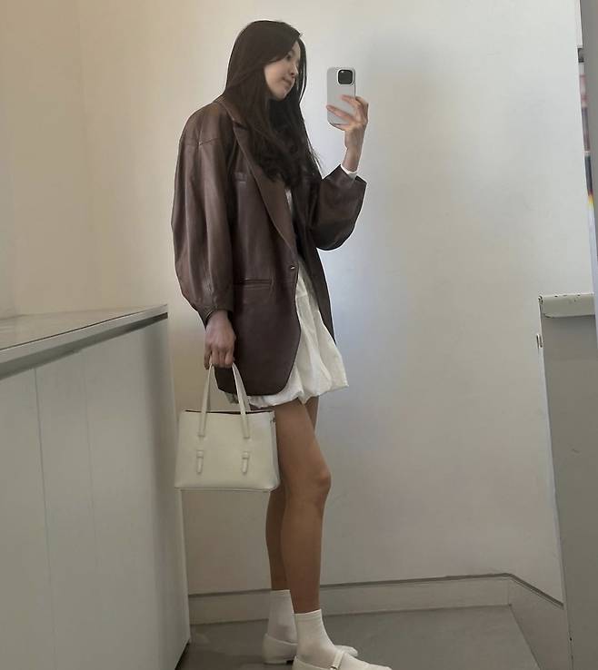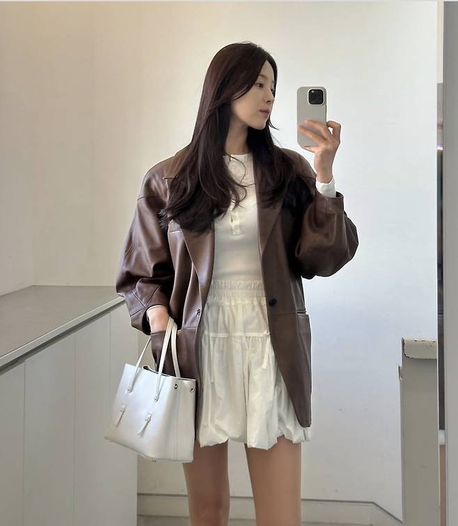 한지혜는 부드러운 광택이 도는 브라운 가죽 재킷을 툭 걸치고, 화이트 셔링 미니 스커트로 소녀감성과 클래식함을 절묘하게 믹스매치했습니다.