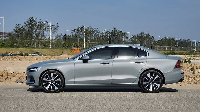 상당히 공들였다는 생각이 드는 측면 디자인이다. 볼보 S60은 기본적으로 전륜구동을 택했지만, 비율 상으로는 수입 후륜구동 세단과 큰 차이가 없어 보인다. 앞서 설명한 내용대로 보닛 노즈를 최대한 앞당겨 연장했고, 앞바퀴와 문 사이 거리가 길게 늘어져 있기 때문이다. 전체적으로 앞뒤 펜더의 볼륨감을 키워 탄탄한 인상을 남기기도 한다. 특히 두껍게 주름이 잡혀있는 웨이스트 라인이 역동적인 분위기를 강조한다. C 필러와 트렁크 리드가 완전히 구분되는 차체 형식은 보수적인 '세단'의 실루엣에 충실하다.