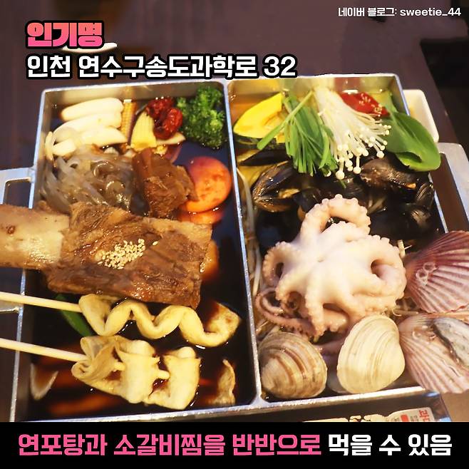 이번에는 송도로 갑니다. 런닝맨에서 여름 보양식 맛집으로 나온적 있는 <인기명>이라는 곳이에요. 몸에 좋은 연포탕과 소갈비찜을 반반으로 같이 주문할 수 있다는 점이 너무 매력적이었어요. 전복까지 큼지막하게 들어 있어서 보양식으로 정말 손색이 없을 것 같아요.