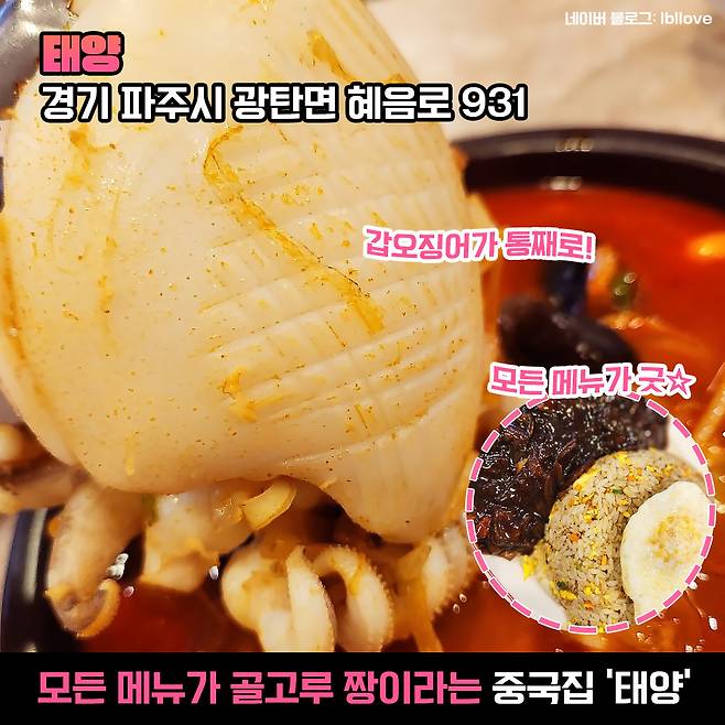 두 번째는 런닝맨 멤버들이 ‘3대 짬뽕집’이라고 극찬하는 파주 중국집 <태양>이에요. 전국각지로 촬영하러 다니는 멤버들의 픽이기도 하고, BTS ‘진’님이 게스트로 나왔을 때에도 적극 추천하길래 여긴 찐이겠다 싶었어요. 후기들을 보니 매장도 깔끔하게 잘 정리되어 있는 모양이에요.