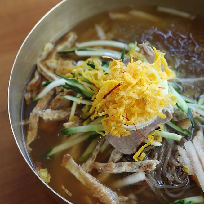 진주냉면은 교방음식으로 시작해 지역 재력가들의 야식으로 사랑받으며 그 명성을 이어왔죠. 메밀면을 기본으로 하지만 그 명성은 단연 고명에서 빛나는데요. 육전, 배, 김치, 오이, 달걀노른자로 이루어진 다섯 가지 고명은 그 자체로 눈을 즐겁게 하고, 전복과 해삼이 더해지면 옛날의 화려함이 떠오릅니다.