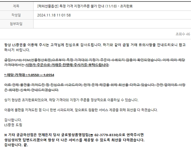 LS증권은 어제(18일) "FCM(선물청산회원)으로부터 특정 가격대 지정가 주문이 수취되지 않음이 확인됐다"며 지정가주문 오류 사실을 자사 홈페이지에 공지했습니다.