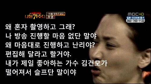 평소 김건모와 친분이라곤 하나도 없던 이소라가 대뜸 "내가 제일 좋아하는 가수 김건모가 떨어져서 슬프단 말이야" 어거지를 부리기 시작한다.