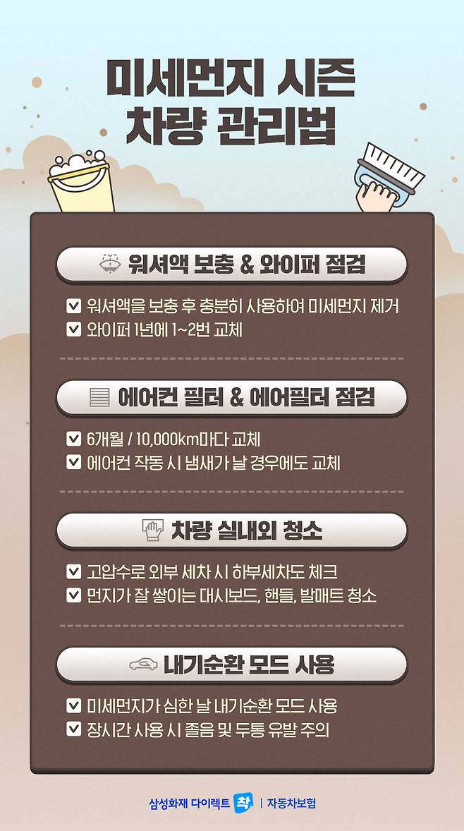 지금까지 미세먼지 시즌을 맞아 올바른 차량 관리법을 알아보았습니다. 미세먼지는 차량 운전자는 물론 차량에도 악영향을 미치는 만큼 올바른 관리 방법으로 차와 운전자, 그리고 가족들의 건강까지 모두 지키시길 바랍니다!