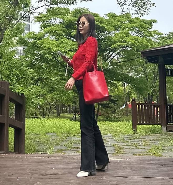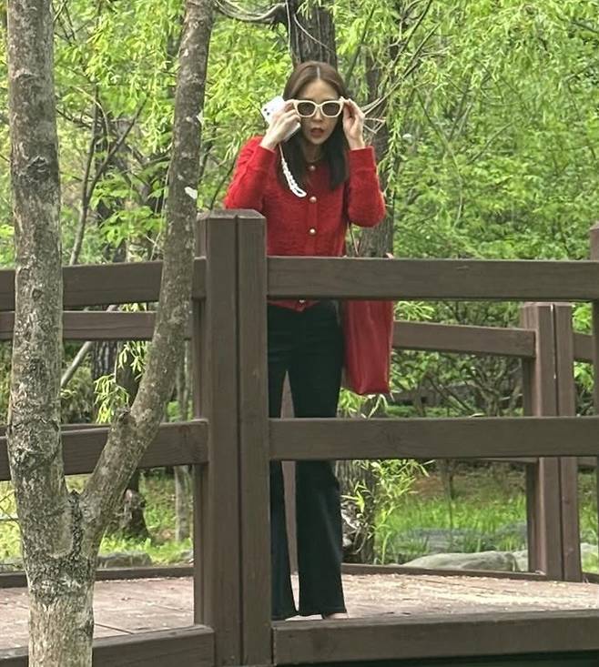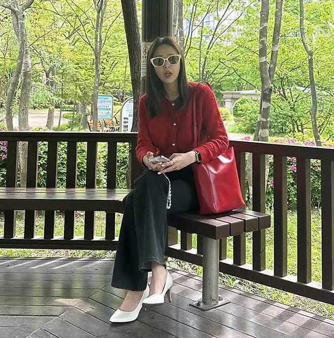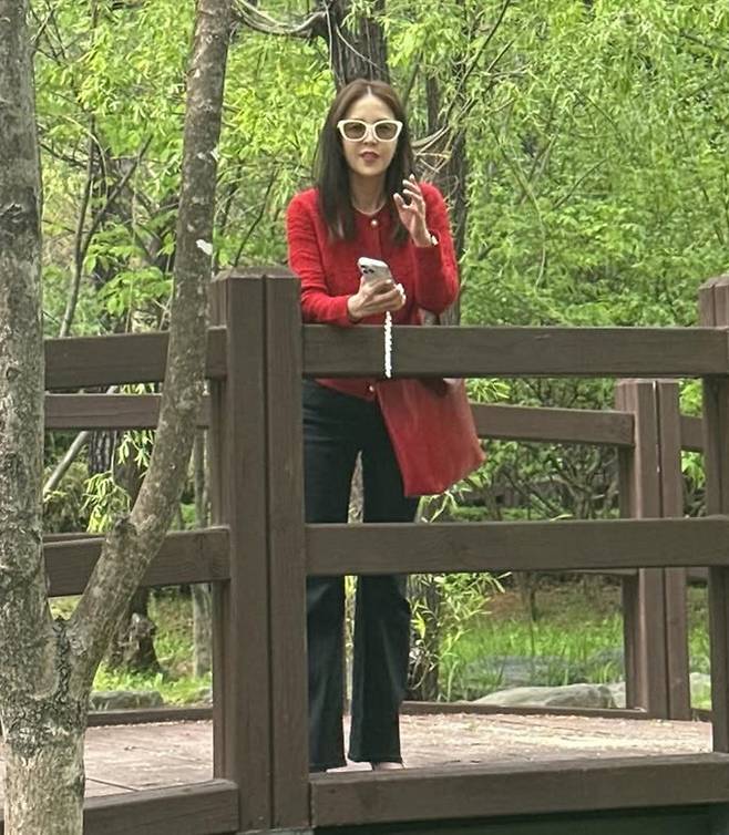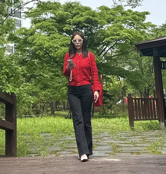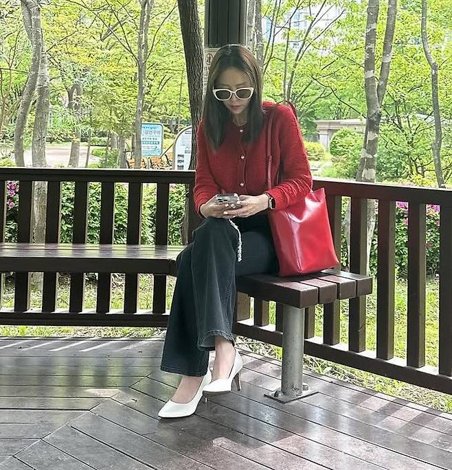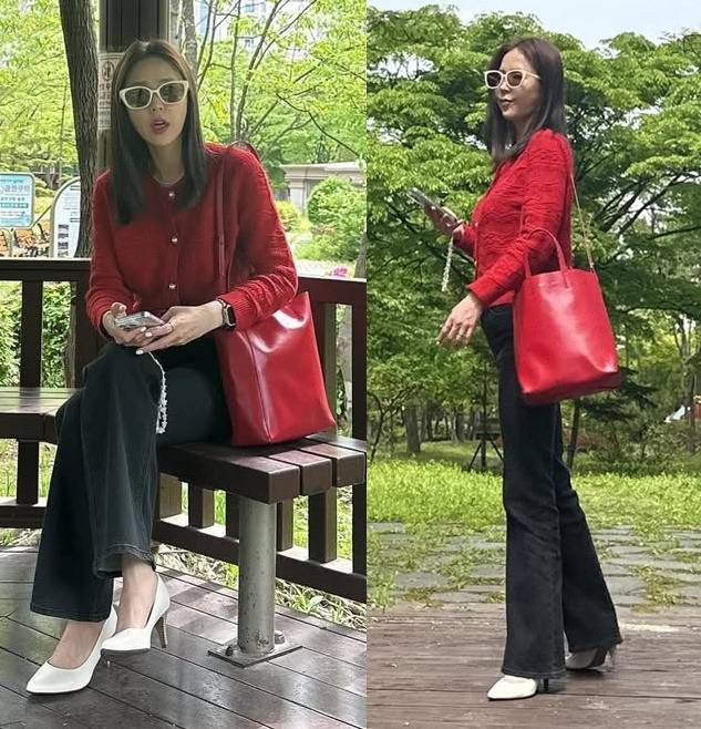 공개된 사진 속 신지는 레드 니트 카디건과 블랙 팬츠, 여기에 강렬한 레드 숄더백으로 깔맞춤한 레드룩으로 부모님댁을 찾은 모습이다.