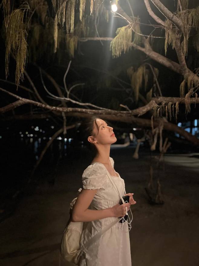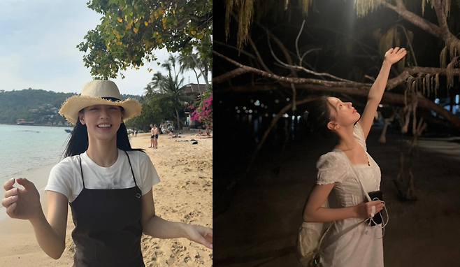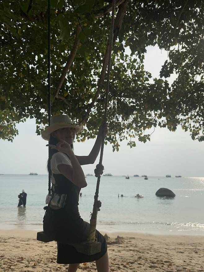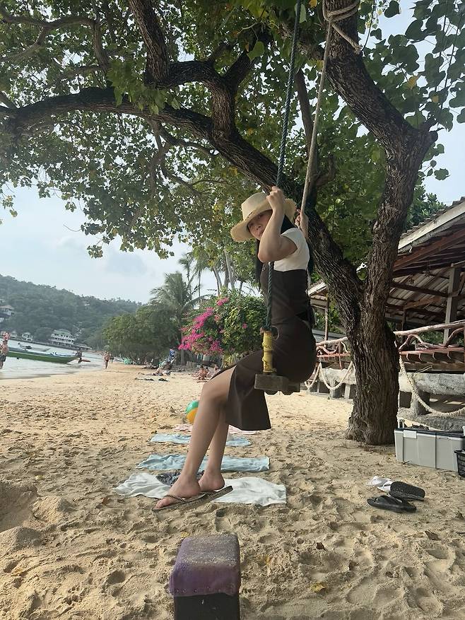 사진 속 미연은 고운 모래사장과 푸른 바다를 배경으로 여유로운 한때를 즐기고 있다.