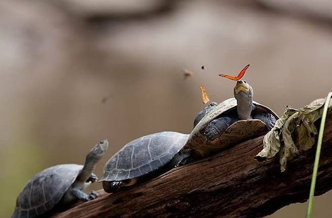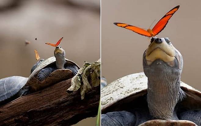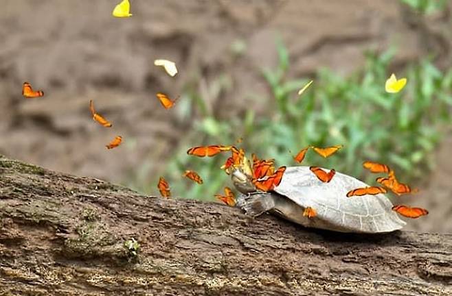 에콰도르 관광국이 공개한 이 사진은 서부 아마존에서 줄리안 나비(Julia butterflies)라는 이름을 가진 나비가 거북의 눈물을 먹고 있는 모습을 찍은 것이라고 합니다.