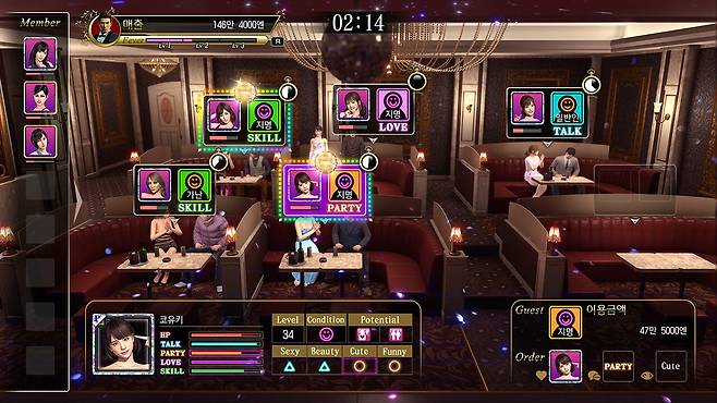 손님이 선호하는 캐스트를 매칭시키면 만족한 손님은 더욱 많은 돈을 쓰게 된다. 고용 가능한 캐스트는 수십 명에 달하며 능력도 천차만별. 또한, 성장시키면 능력이 상승해 손님을 더욱 만족시키기 쉬워진다. 손님의 취향을 파악하고 캐스트를 육성하며 매상을 높여 전국 No.1 캬바클럽을 만드는 것이 목표.