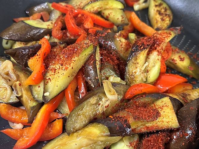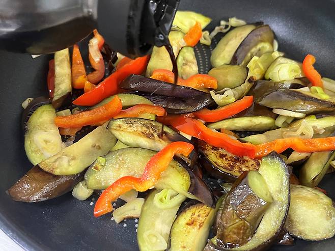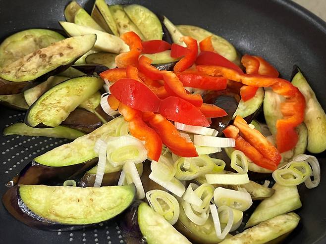 가지가 숨이 죽기 시작하면 파프리카와 대파를 넣고 함께 볶습니다. 파프리카 대신 양파 등을 넣어도 잘 어울려요.