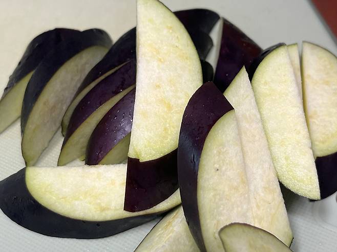 가지 2개는 어슷하게 썰어서 준비해 주세요. 너무 두껍게 썰지는 마시고 1.5cm~2cm 정도 두께로 썰어 주세요.