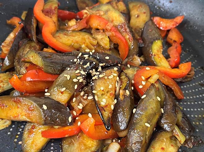 마지막에 통깨를 뿌려서 마무리하세요. 가지 볶음은 바로 드시는 것보다 한 김 식혀서 먹으면 양념이 안쪽까지 잘 배어들어 더욱 맛있습니다.