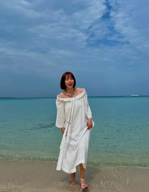 조윤희는 어깨를 자연스럽게 드러내는 오프숄더 스타일의 롱 화이트 원피스를 착용해 여름 특유의 분위기를 극대화했다.