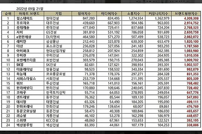 ‘자이·래미안·푸르지오’ 등 국내 유명 아파트 브랜드들은 각기 다른 건설사가 맡아 짓는데 디자인과 안정성, 브랜드 가치 등에 있어서 차이가 존재한다. 지난 9월 21일 한국기업평판연구소에서는 국내 24개 아파트 브랜드 중에서 한국인들에게 가장 평판이 좋은 순위를 조사해 발표했다.