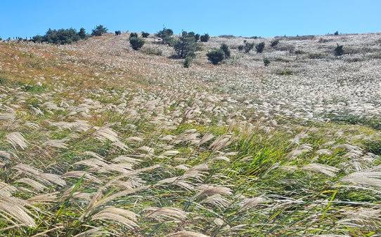 특히 끝없이 펼쳐진 억새밭과 풍력발전기 그리고 큰사슴이오름과 따라비오름을 한 눈에 조망 가능해 이색적인 풍경을 볼 수 있습니다.