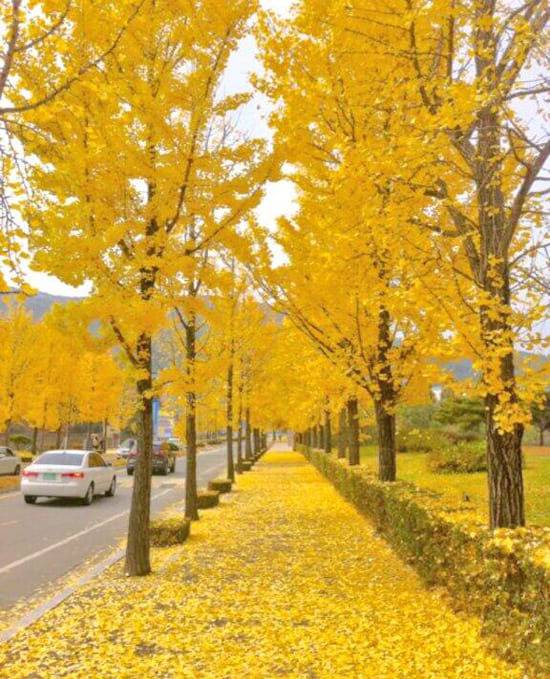 긴 은행나무 가로수길 아래 떨어진 은행나무 잎이 많든 노란 카페트 위에 사진을 남기기도 좋습니다.