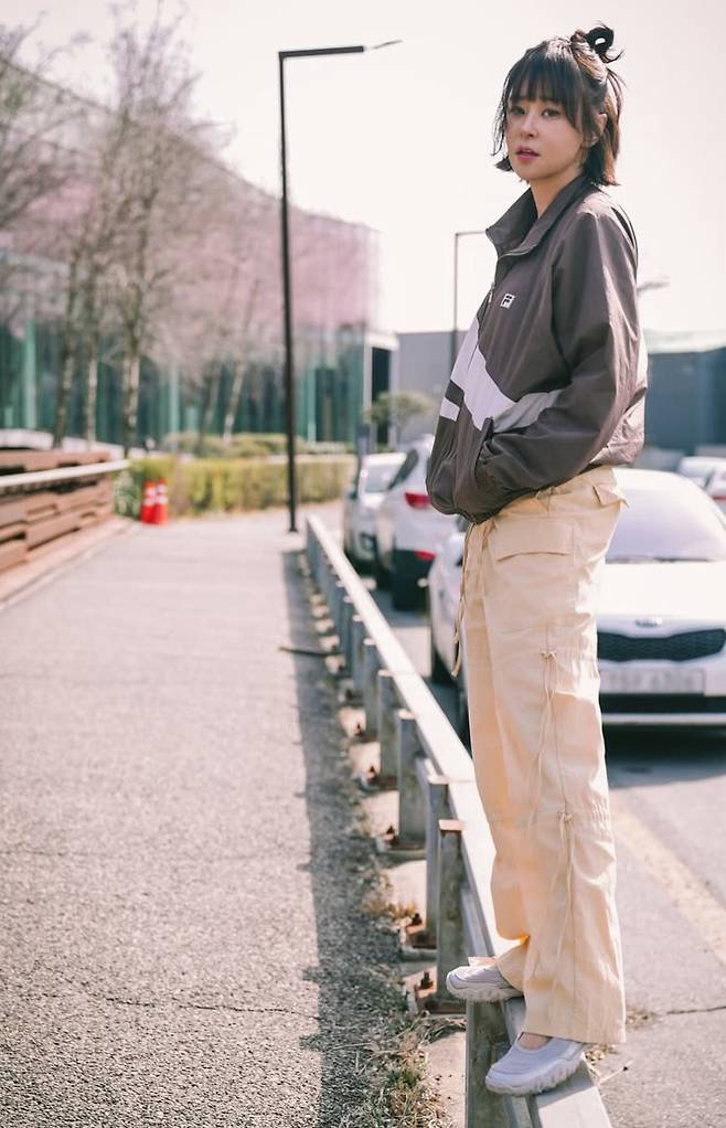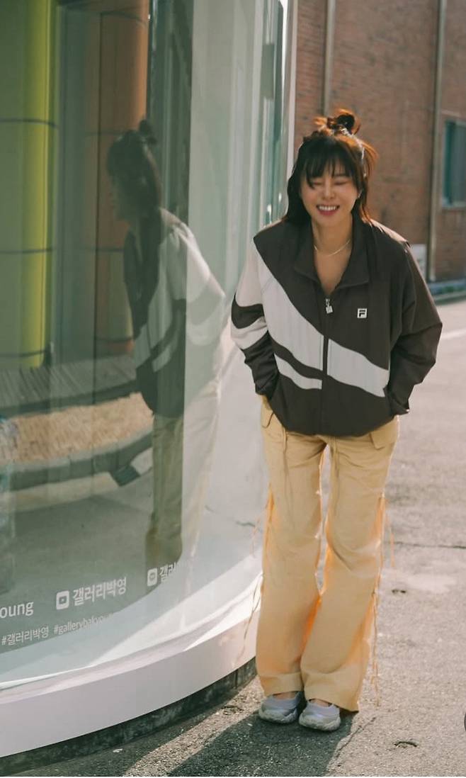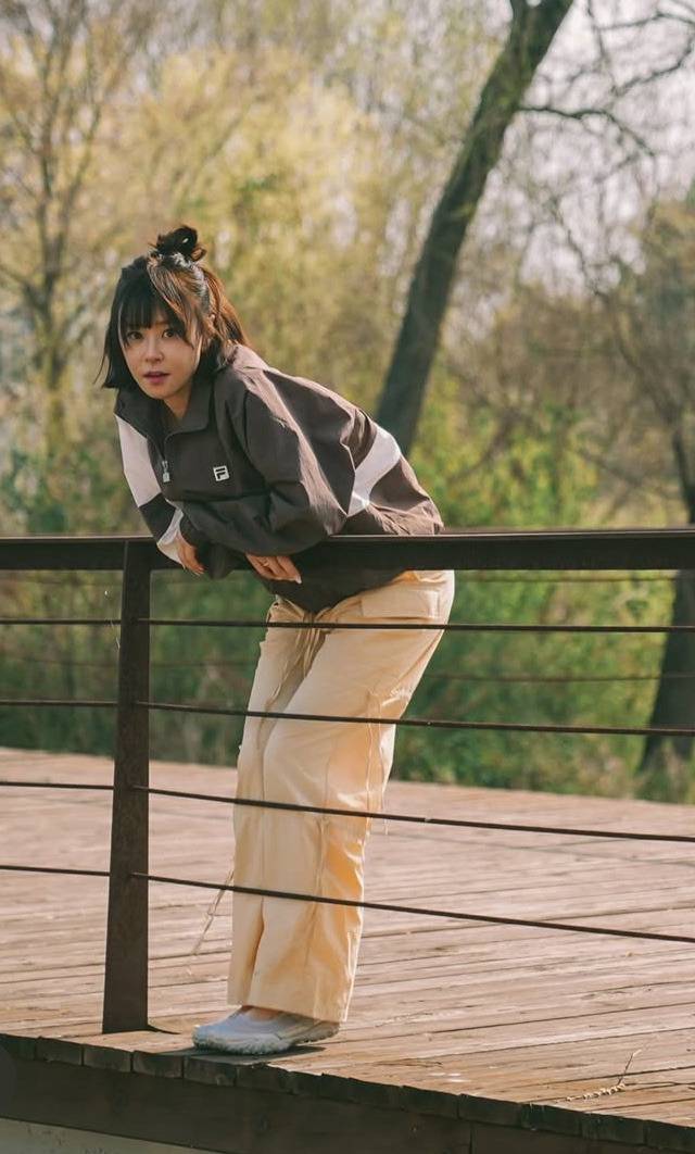 브라운 컬러의 지퍼 점퍼와 라이트 베이지 팬츠의 조합으로 자연 속에 어울리는 톤온톤 스타일링을 완성했으며, 활동성을 살린 루즈한 실루엣이 여유로운 분위기를 자아냈습니다.