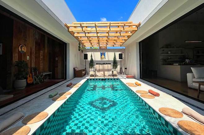 수영장은 관상용이지만 바로 옆에 커다랗고 편안한 소파에 앉아 에어컨을 쐬며 물멍을 할 수 있습니다. 수영장을 중앙에서 볼 수 있는 동남아 호텔에서 볼법한 의자가 구비되어 가족, 친구들과 함께 방문하면 평온하고 차분한 휴식을 취할 수 있을 것입니다.