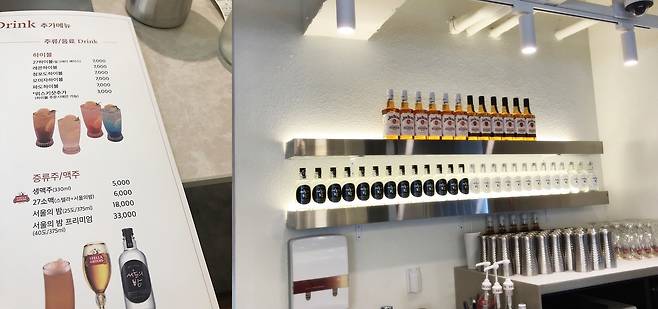 매장에는 이렇게 주류 코너도 마련돼있었어요. 요즘 유행인 하이볼부터 다양한 증류주와 맥주가 있습니다. 저녁에는 술을 마시면서 안주용으로 메뉴를 즐기는 것도 좋을 것 같네요.