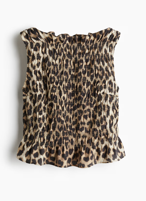 이나은이 선택한 이 제품은 스웨덴 SPA 브랜드 H&M의 ‘스모킹 탑’으로, 가벼운 비스코스 혼방 소재에 레오파드 패턴을 더한 디자인이 특징이다.