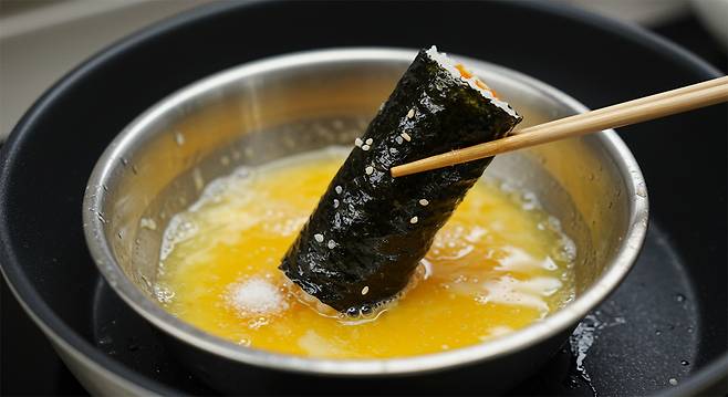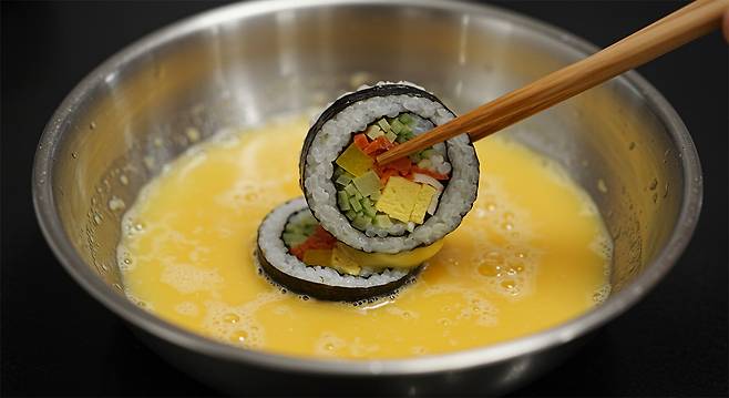 TIP: 계란물을 묻힐 때 너무 오래 담그지 않도록 주의하자. 김밥 속 재료가 흐트러질 수 있다.