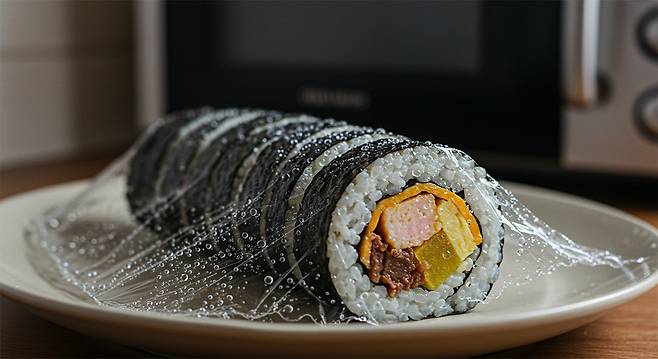 가장 손쉬운 방법은 전자레인지를 활용하는 것이다. 김밥을 전자레인지에서 다시 촉촉하게 데우려면 물을 조금 뿌려주는 것이 효과적이다. 김밥 위에 물을 살짝 뿌리고, 랩을 덮어 전자레인지에 넣어 30초에서 1분 정도 돌리면 김밥이 부드럽게 돌아온다. 중요한 점은 전자레인지용 랩을 사용하는 것이다. 일반적인 랩이나 키친타올은 사용하지 않도록 한다.