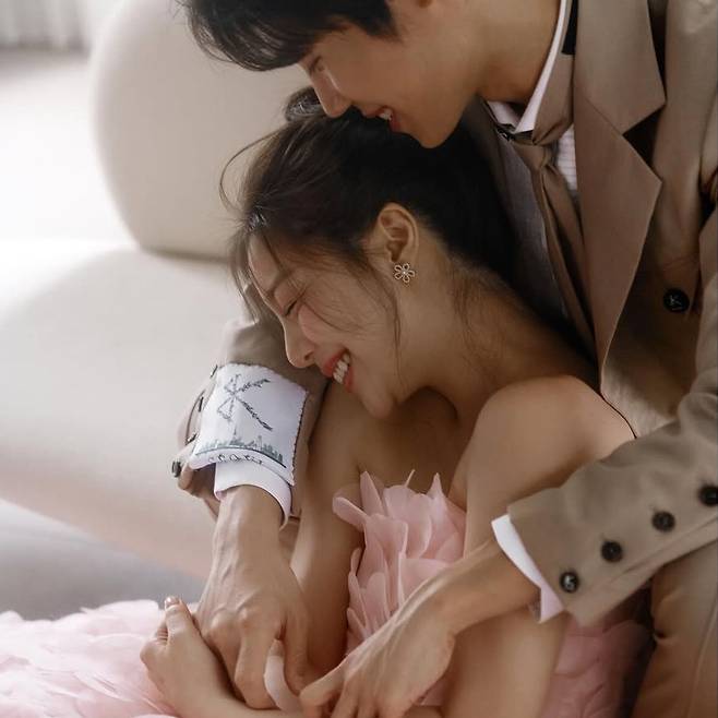 심플한 화이트 드레스를 착용한 에일리는 서로의 얼굴을 부드럽게 감싸면서