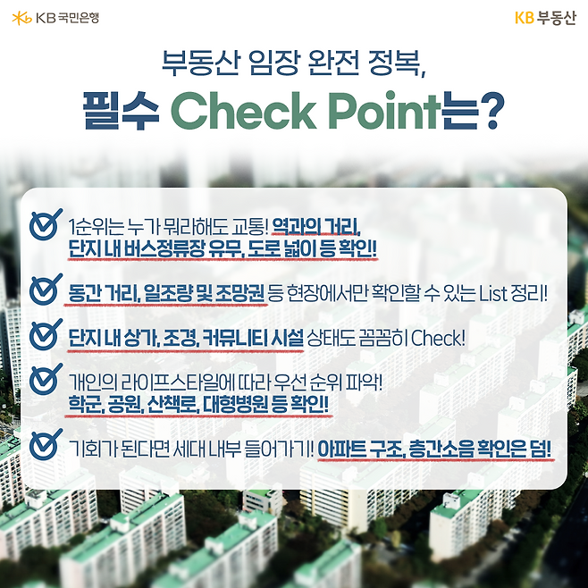 지금까지 부동산 임장법에 대해 자세히 알아봤는데요. 임장은 많이 하면 할수록 지역과 단지를 보는 눈이 향상됩니다. 만약 부동산을 매수하거나 투자할 계획이 있다면 임장은 필수라는 것을 잊지 마시고, 성공적인 부동산 전문가로 거듭나길 KB부동산이 기원하겠습니다.