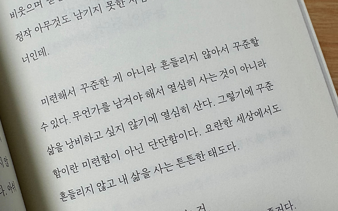 이 나이에는 꾸준함 자체가 큰 능력으로 보인다. 하지만 진짜 꾸준함은 성실함보다 흔들리지 않는 마음에서 나온다. 책 『어른의 행복은 조용하다』에서는 이렇게 말한다. “미련해서 꾸준한 게 아니라 흔들리지 않아서 꾸준할 수 있다.”